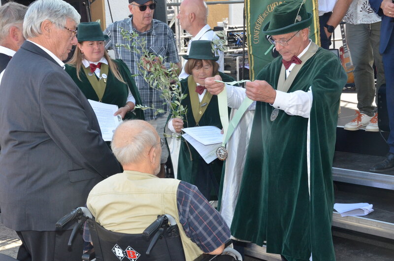 Während der Zeremonie wurden alle drei per Olivenzweig in den Ritterstand erhoben. Eine südfranzösische Olive gab es natürlich auch noch – im wahrsten Sinne des Wortes als Vorgeschmack auf die nächsten großen Feierlichkeiten zur 60-jährigen Partnerschaft zwischen Mechernich und Nyons in zwei Jahren.