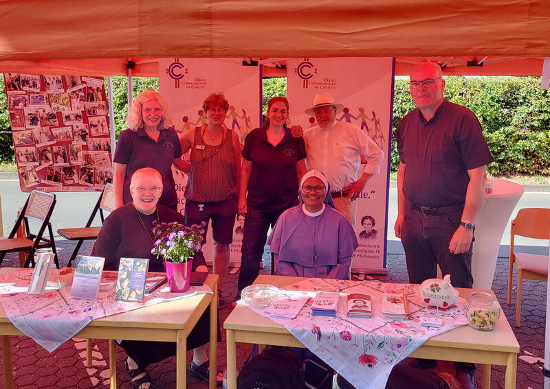 Die Pfarrer Erik Pühringer und George Stephen Rayappan Packiam, Diakon Manni Lang und die Communio-Schwestern Theresia und Lidwina sowie die aus Indien stammende Samaritan-Schwester Nimisha vom Sozialwerk des Ordo Communionis in Christo sowie nebenan am evangelischen Stand Pfarrerin Susanne Salentin und ihr Team standen Rede und Antwort zu religiösen und kirchlichen Fragen.