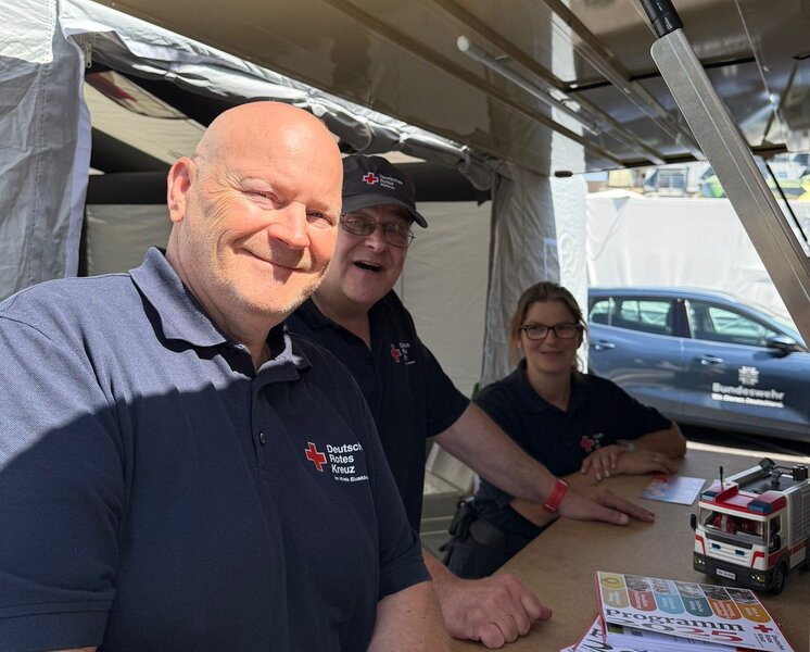 Die Plätze der Mechernicher Innenstadt wurden derweil zur Ausstellungsfläche verschiedenster Unternehmen und Vereine – die meisten davon aus Mechernich oder dort vertreten – wie der äußerst rührige Rotkreuz-Ortsverein unter dem Vorsitz von DRK-Kreisgeschäftsführer Rolf Klöcker und Bereitschaftsleiter Sascha Suijkerland.