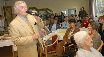 Bürgermeister Dr. Hans-Peter Schick als Vorsitzender des 300 Mitglieder zählenden Fördervereins und Norbert Arnold, der Geschäftsführer des Sozialwerkes im Ordo Communionis in Christo in Mechernich gratulieren dem beliebten Kölner Stimmungssänger herzlich. Das Hospiz kann bis zu zwölf Gäste aufnehmen. Menschen werden dort mit denkbar großer menschlicher Fürsorge und palliativmedizinischer Versorgung betreut.