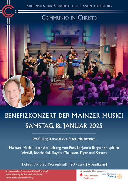 Dieses Jahr am Samstag, 18. Januar, spielen die „Mainzer Musici“ ab 18 Uhr Werke von Antonio Vivaldi („Der Frühling“ und „Der Winter“ aus „Vier Jahreszeiten“), Luigi Bocherini („Das Vogelreich“), Joseph Haydn („Sinfonia Berchtolsgadensis“), Ernest Chausson („Poème“ op. 25), Edward Elgar („Streicherserenade“ op.20) und Johann Strauss („Pizzicato-Polka“)