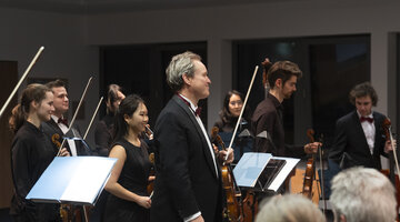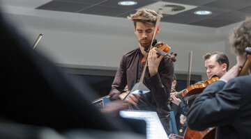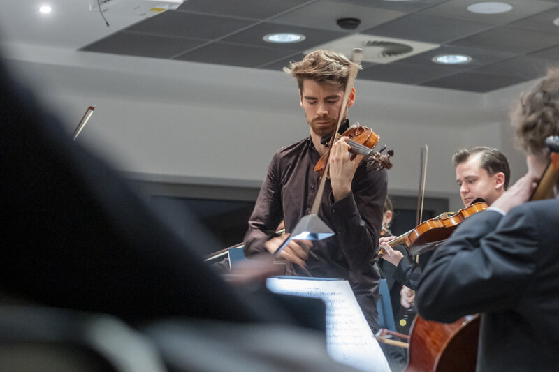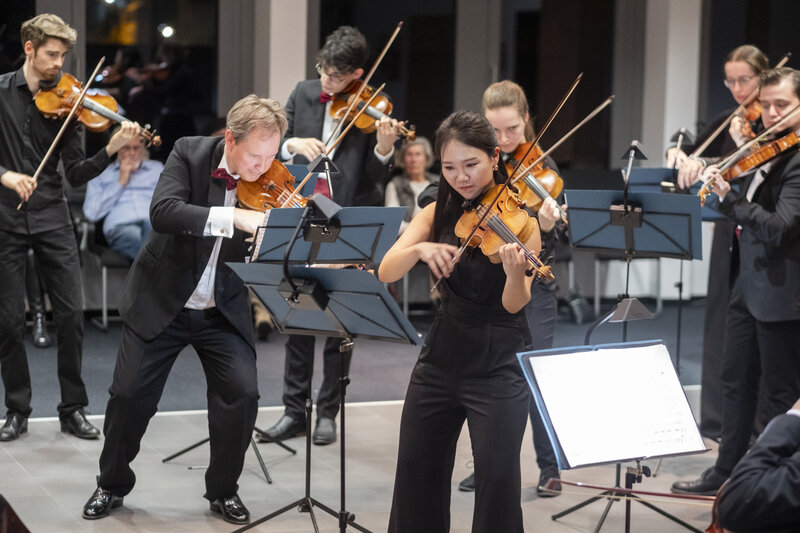 „Das ist der romantische Block“, erläutert ihr Professor. Das Stück „Poème“ von Ernest Chausson basiere auf einer Novelle des russischen Dichters Iwan Turgeniew. „Eine unglückliche Liebesgeschichte natürlich und das ist für die Sologeige auch. Da kann man schmatzen und seufzen und zwischendurch einen Walzer tanzen und so. Und am Ende dann ein tragisches Ende“, fasst Benjamin Bergmann zusammen. Der hat sich die Mühe gemacht, das Stück, das eigentlich für ein großes Orchester geschrieben wurde, für das Kammerorchester mit nur zehn Streichern umzuschreiben. „Ich habe sogar versucht, die Harfe einzubauen, mal sehen, ob das Publikum das hört“, so der Konzertmeister, der für den anschließenden Part eine Streicherserenade von Edwar Elgar ausgewählt hat, um dann mit der „Pizzicato Polka“ von Johann Strauß fulminant zu enden.