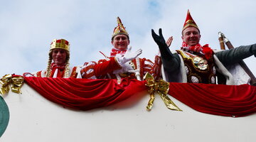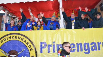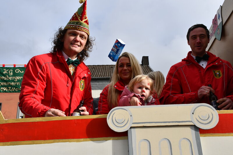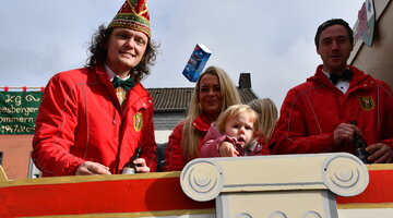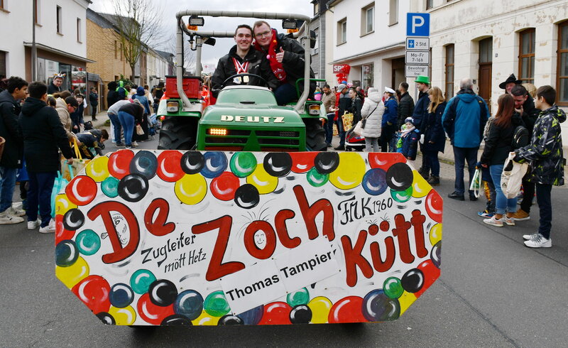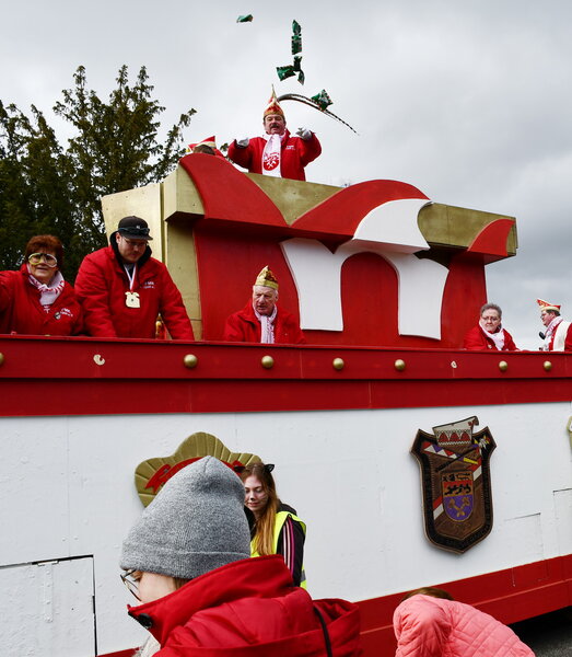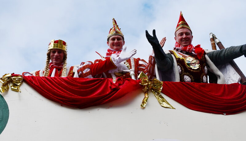 Dazu kamen eine ganze Reihe stattlicher Festkomitee- und Prunkwagen der Gesellschaften, denen das allen voranfahrende Kommerner Dreigestirn allerdings die Schau nahm. Schmerzlich wurde einem vor Augen geführt: Die Bleiberg-Metropole ist seit Jahren arm an Tollitäten. Jungfrau Thomas Bank, Bauer Marc Schoeller und Prinz Jan I. (Jaeck) von der anderen Seite des Altusknipp spiegelten aber auch das gute Verhältnis zwischen ihrer Karnevalsgesellschaft „Gressberger“ und den drei Mechernicher Karnevalsclubs Prinzengarde, „Bleifööss“ und Festausschuss Mechernicher Karneval wider.