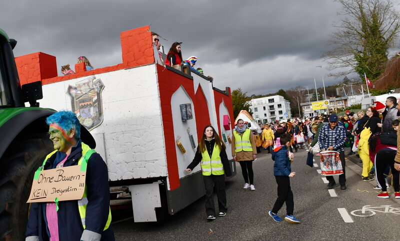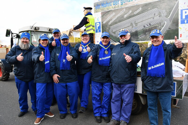 Die „Blaumänn“ hatten mit dem Pendlerparkplatz Breitenbenden wieder ein lokales Thema persifliert – auch die Mechernicher Redaktion der Agentur ProfiPress bekam ihr Fett weg: Ausgerechnet Altkarnevalist Manni Lang hatte anlässlich der Sessionseröffnung am 11.11. geschrieben, in Mechernich würden die „Blaumänn“ wieder beim „Veilchendienstagszug“ an den Start gehen. Dass es in Wirklichkeit „Tulpensonntagszug“ heißt, war jetzt als Korrektur dieser „Zeitungsente“ auf der Zugmaschine der „Blaumänn“ zu lesen.