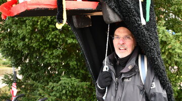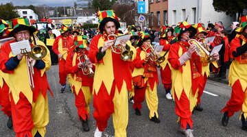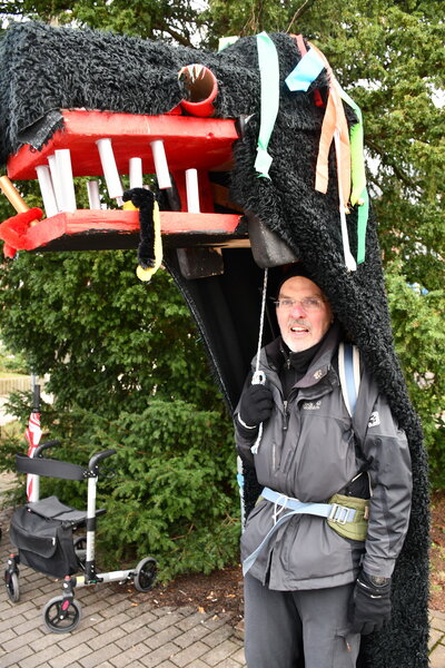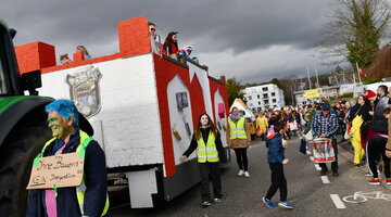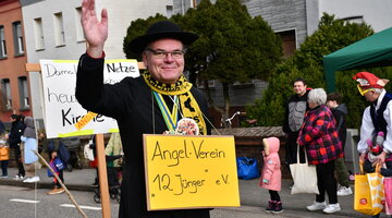 Doch die Gruppenstärke ist es nicht allein, was einen auch sehr originellen Karnevalszug ausmachte. Dazu trugen als närrische Einzelkämpfer Pfarrer Erik Pühringer in Soutane vom „Angelverein 12 Jünger“ und Helmut Bucher mit einem selbstgebauten „Schnappviech“ bei, das seinen Ursprung weiter südlich in der alemannischen Fassenacht hat.