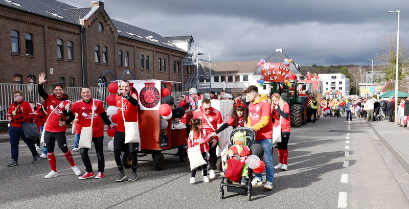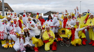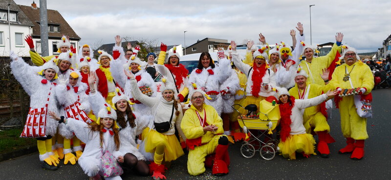 Nicht weniger als 28 Hühner der Traditionsgruppe „Klüngelsbröder“ um Präsident Carlo Flaschentreher huschten durch Straßen und Gassen, „Blaumänn“ und Rotes Kreuz sowie die seit Existenz des Mechernicher Karnevalszuges mit ziehenden Clowns brachten es auf jeweils ein Dutzend fröhliche Zugmitmacher, die TuS auf zwei Dutzend Karneval feiernde Kicker.