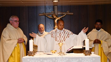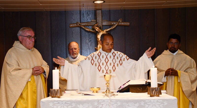 Concelebrating with the Superior General were Communio-Spiritual Father Rudolf Ammann ISch and Father Dr Joseph Chelamparambath, the pastor of the Indian Syro-Malankan Catholic community in Bonn. Also at the altar were Father Jean Elex Normil, originally from Haiti and who has been working in the Archdiocese of Cologne for almost 17 years, and Father Patrick Mwanguhya from the diocese of Fort Portal in Uganda, who is doing voluntary service in Germany for five years at the request of his home bishop Robert K. Muhiirwa, as well as Deacon Manfred Lang and Deacon Tilj Puthenveettil.